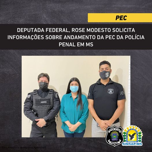 A Deputada Federal, Rose Modesto solicitou reunião com a diretoria do SINSAP/MS nesta segunda, 25, para questionar o sindicato sobre o andamento da PEC que cria a Polícia Penal em Mato Grosso do Sul. A parlamentar lembrou da grande luta dos agentes penitenciários no Congresso Nacional pelo reconhecimento da Categoria e criação da Polícia Penal.
