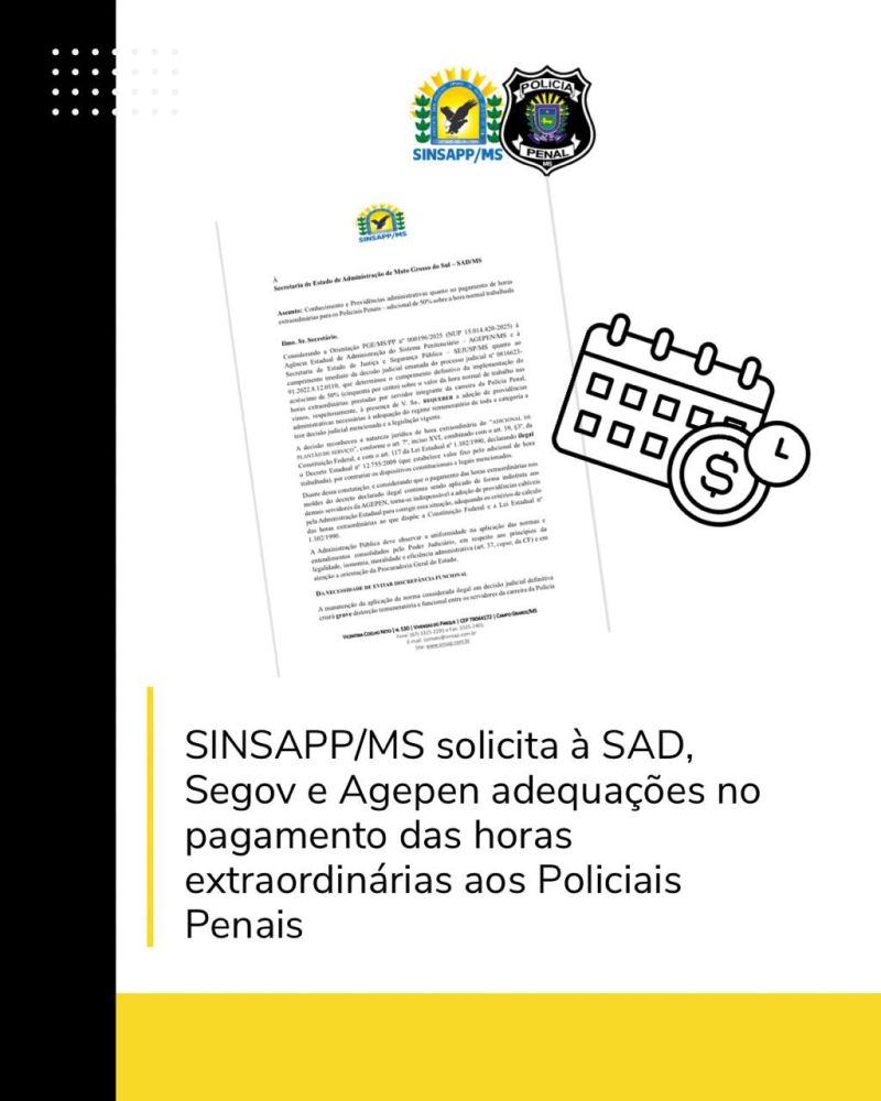 SINSAPP/MS solicita à SAD, Segov e Agepen adequações no pagamento das horas extraordinárias aos Policiais Penais