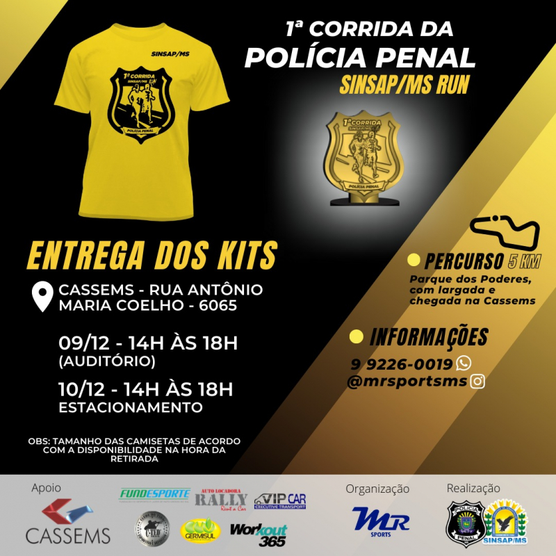 Os participantes da 1ª Corrida da Polícia Penal - SINSAP/MS Run, que será realizada neste domingo (11), poderão retirar os Kits nesta sexta-feira e sábado, na sede da CASSEMS, localizada na Rua Antônio Maria Coelho, 6065.