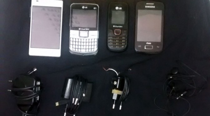 sanitário quatro aparelhos celulares, quatro carregadores e três fones de