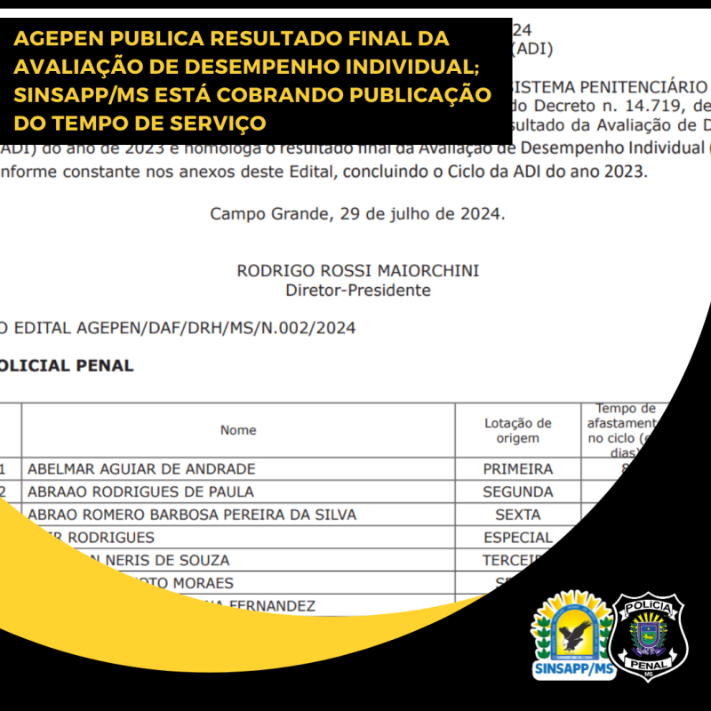 A Agepen (Agência Estadual de Administração Penitenciária) publicou, nesta terça-feira (30), o resultado final da ADI (Avaliação de Desempenho Individual). A publicação pode ser conferida no Diário Oficial do Estado, a partir da página 196. O link está disponível nos stories!