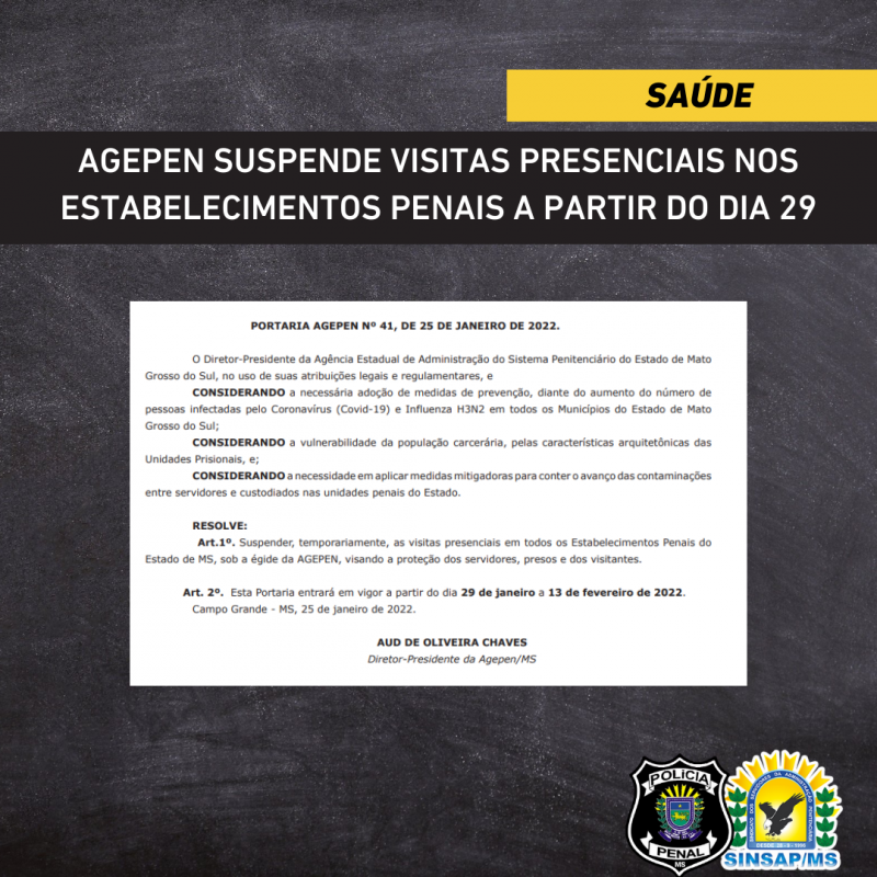 A AGEPEN publicou portaria para “suspender, temporariamente, as visitas presenciais em todos os Estabelecimentos Penais do Estado de MS. A intenção é proteger os servidores, presos e os visitantes. A ação é tomada após a mobilização do SINSAP/MS, que oficiou as autoridades do estado diante do quadro de avanço da COVID-19 no sistema prisional, que gerou afastamento de policiais penais e sobrecarga de trabalho para os servidores que ficaram. O presidente do SINSAP/MS, André Santiago, visitou unidades prisionais do Estado de Mato Grosso do Sul, para fazer levantamento da situação.