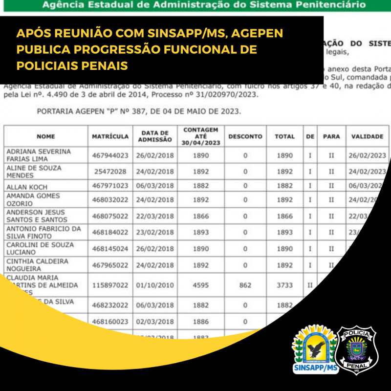 A publicação ocorre na mesma semana em que a diretoria do SINSAPP/MS se reuniu com o RH da Agepen para discutir várias questões envolvendo os servidores, entre elas a progressão funcional e a promoção.