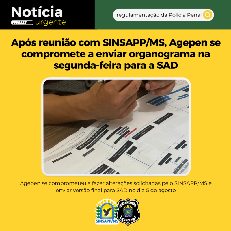 “Com a nova legislação, que vai regulamentar a carreira, eles vão analisar tudo o que é relacionado à Polícia Penal. Fizemos as ponderações na Agepen, solicitações de algumas alterações, que foram acatadas, e, agora, serão feitas as adequações. A Agepen se comprometeu a entregar na segunda-feira, na SAD”, destacou o presidente do SINSAPP/MS, André Santiago.