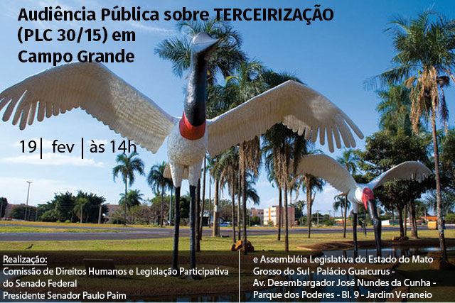 A CDH (Comissão de Direitos Humanos) e Legislação Participativa do Senado Federal estará, nesta sexta-feira, às 14h, na Assembleia Legislativa de Mato Grosso do Sul, para realizar audiência pública sobre o Projeto de Lei da Câmara (PLC) 30/2015 que trata do tema terceirização.