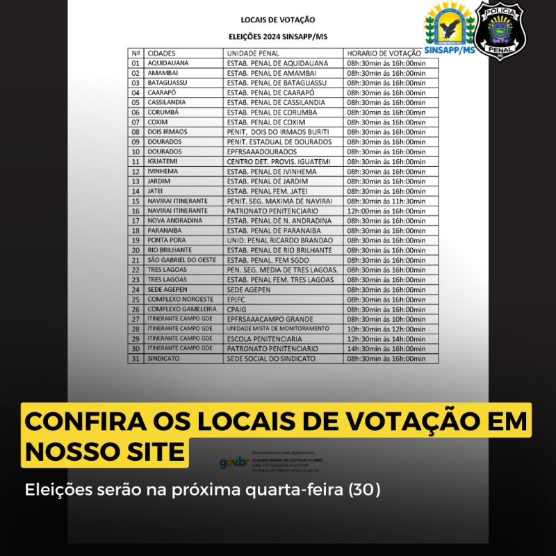 O SINSAPP/MS torna público os locais de votação das eleições do Sindicato, que serão realizadas na próxima quarta-feira (30).