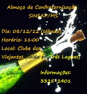 É COM SATISFAÇÃO QUE CONVIDAMOS VOCÊ E SUA FAMÍLIA PARA O ALMOÇO DE CONFRATERNIZAÇÃO DO SINSAP/MS, DIA:08/12/2012 (SÁBADO), A PARTIR DAS 11:00H, NO CLUBE ATLÉTICO DOS VIAJANTES (AV. MINISTRO JOÃO ARINOS, 6.114 - SAÍDA PARA TRÊS LAGOAS - CAMPO GRANDE/MS).