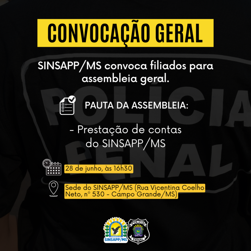 O SINSAPP/MS convoca os filiados para Assembleia Geral nesta sexta-feira (28), às 16h30, para deliberação sobre a prestação de contas.