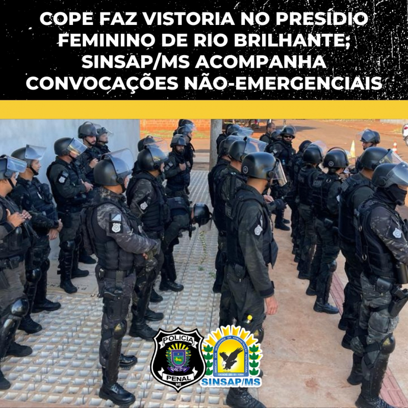 O COPE (Comando de Operações Penitenciárias) fez uma vistoria no Presídio Feminino de Rio Brilhante, na manhã desta quinta-feira (30). O SINSAP/MS, que tem percorrido as unidades prisionais de Mato Grosso do Sul, acompanhou os trabalhos.