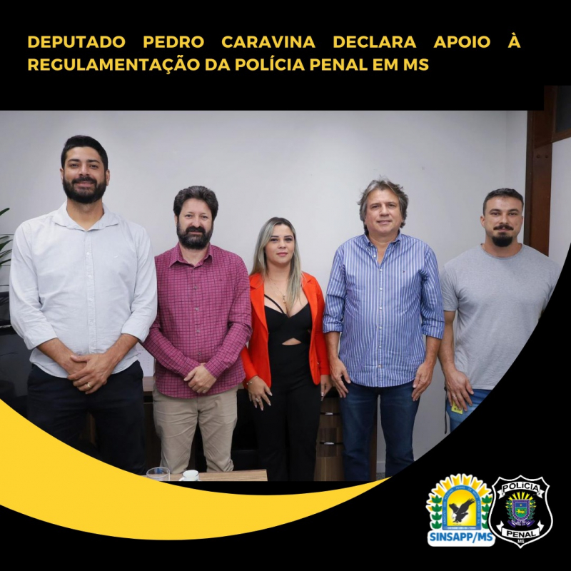 O deputado estadual e ex-delegado Pedro Caravina recebeu o presidente e vice-presidente do SINSAPP/MS, André Santiago e Hernandes Alves, respectivamente. Os policiais penais Dheine Ferreira Martins Arruda e Vitur Matos também acompanharam a agenda.