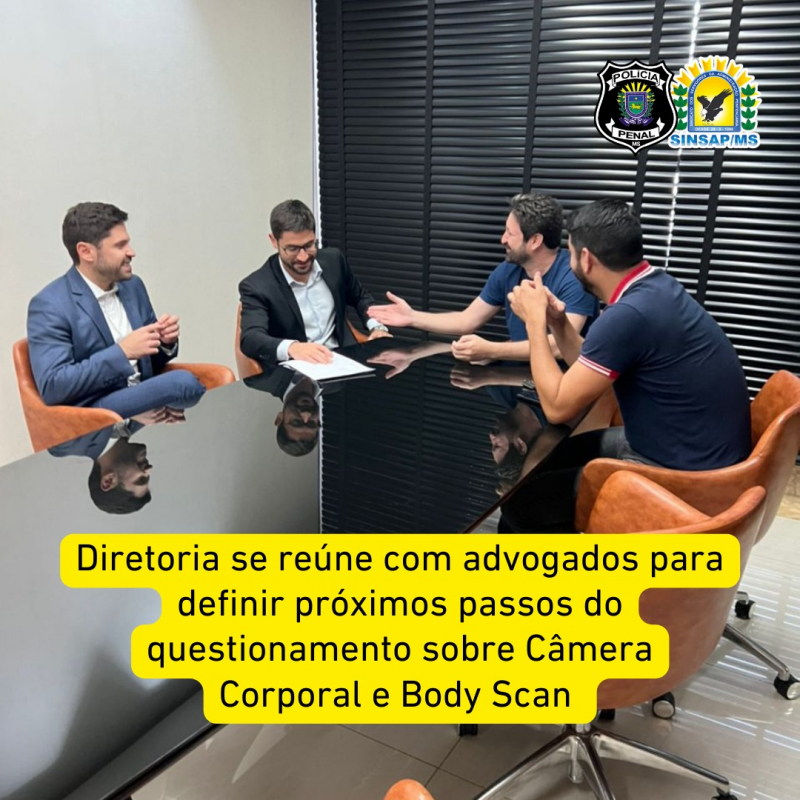 A diretoria do SINSAP/MS esteve reunida com a Assessoria Jurídica do sindicato nesta quinta,02, para tratar de assuntos relativos ao Body Scan e da Câmera Corporal.