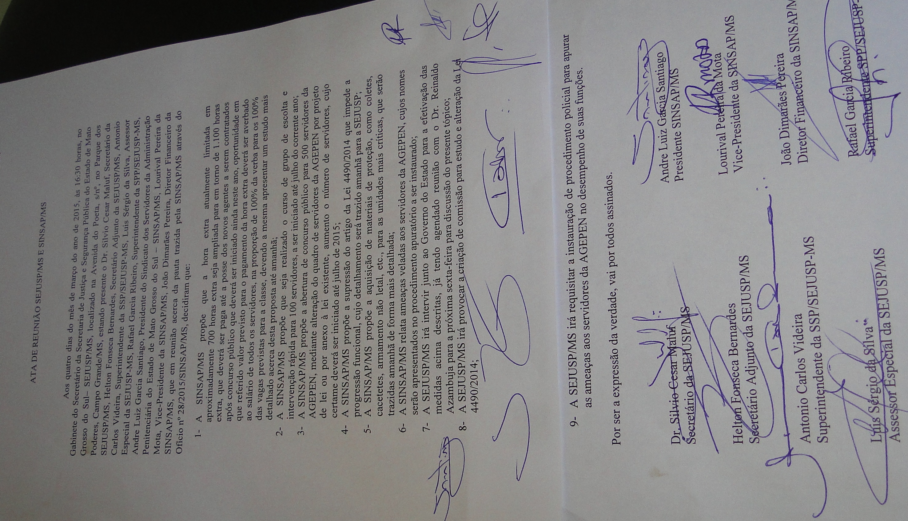 O sindicato dos Servidores Penitenciários do Mato Grosso do Sul -SINSAP – MS torna publica a ATA DE REUNIAO SEJUSP E SINSAP MS realizada nesta quarta feira dia 4 de março de 2015, estando presentes o Presidente, o Secretário Geral e o Diretor financeiro do SINSAP MS, para conhecimento dos servidores penitenciários, onde ficou compromissado pelo Secretario de Estado de Justiça e Segurança Publica as propostas elencadas na referida Ata, aguardando reunião a ser realizada na Governadoria na data de 06 de mar;o de 2015, afim de serem ratificadas pelo governador do estado os prazos e as propostas elencadas.