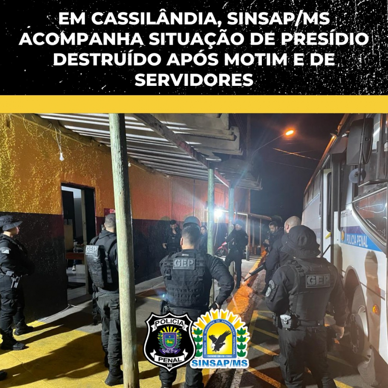 Desde a noite de quarta-feira (22), o SINSAP/MS está em Cassilândia, onde um motim iniciado durante a tarde deixou a unidade destruída. Com capacidade para atender 90 detentos, a unidade abrigava mais de 200, quando começou o motim.