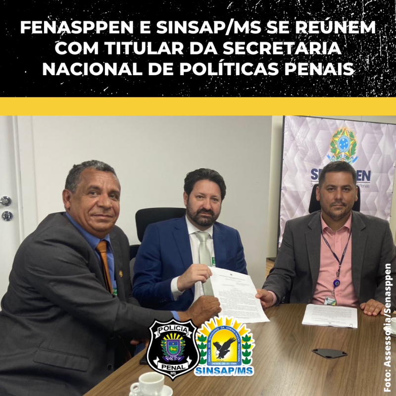 Membros da FENASPPEN, entre eles o presidente do SINSAP/MS, André Santiago, estiveram, na quinta-feira (2), reunidos com o secretário nacional da Senappen (Secretaria Nacional de Políticas Penais), Rafael Velasco, para tratar de assuntos relacionados à carreira da Polícia Penal. O encontro aconteceu na sede da secretaria, em Brasília (DF).