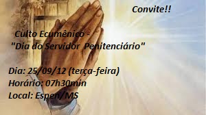 Campo Grande (MS) – A Escola Penitenciária de Mato Grosso do Sul (Espen/MS) promove na próxima terça-feira (25) culto ecumênico em alusão ao Dia do Servidor Penitenciário, com o pastores Christian Anderson Doerzbacher e Antônio Mario dos Santos Souza, e seminarista Bruno Cesar Capistrano.