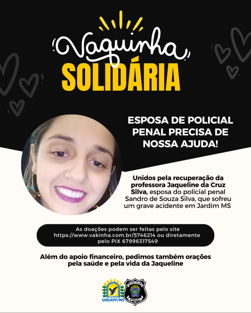 O SINSAPP/MS convoca todos os servidores a se unirem em solidariedade ao policial penal Sandro de Souza Silva, cuja esposa, a professora Jaqueline da Cruz Silva, sofreu um grave acidente de moto em Jardim no dia 25 de setembro e encontra-se internada na Santa Casa em Campo Grande.