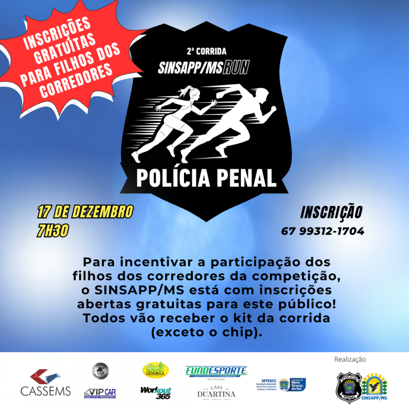 Para incentivar a prática esportiva entre todas as idades, o SINSAPP/MS abriu inscrições para os filhos dos corredores participantes da 2ª Corrida da Polícia Penal. As inscrições serão gratuitas e os participantes vão receber o kit da corrida, exceto o chip de monitoramento de tempo.
