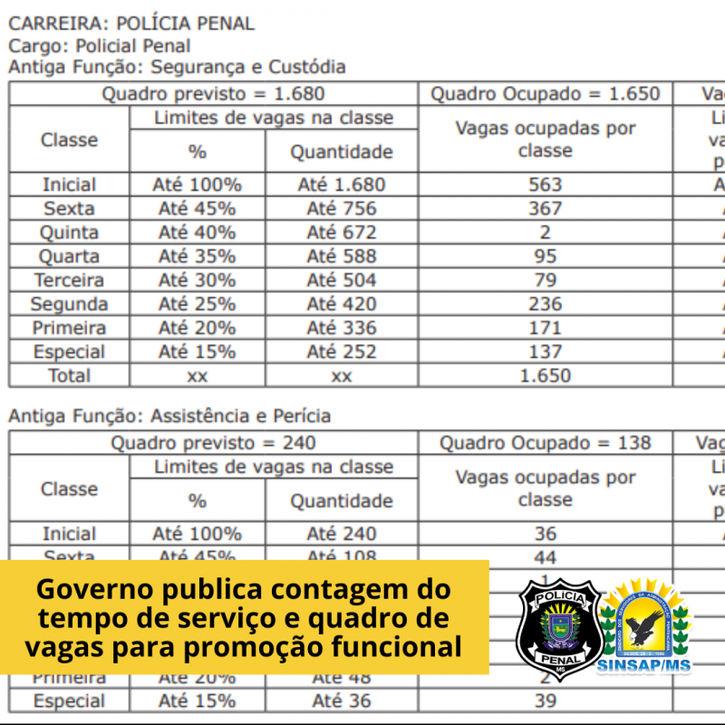 Também foi publicado o quantitativo de vagas para fim da concessão do benefício de promoção funcional dos Policiais Penais.