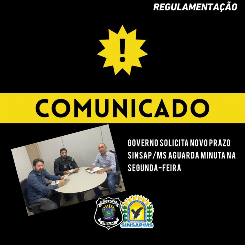 Representantes do Governo solicitaram ao SINSAP/MS prazo até a próxima segunda-feira (14), para apresentar a minuta de proposta da regulamentação da Polícia Penal. A justificativa é de que o Governo do Estado está trabalhado na regulamentação completa e de forma ampla, com toda a estruturação e não apenas na questão salarial.