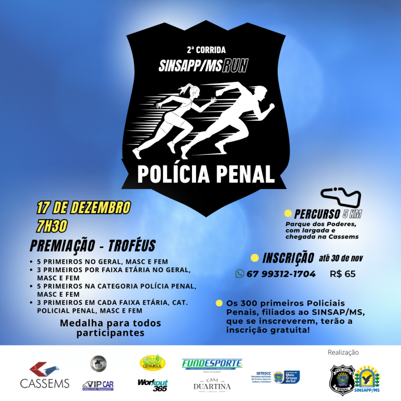 A 2ª Corrida da Policia Penal SINSAPP/MS RUN será realizada no dia 17 de dezembro, com largada às 7h30.