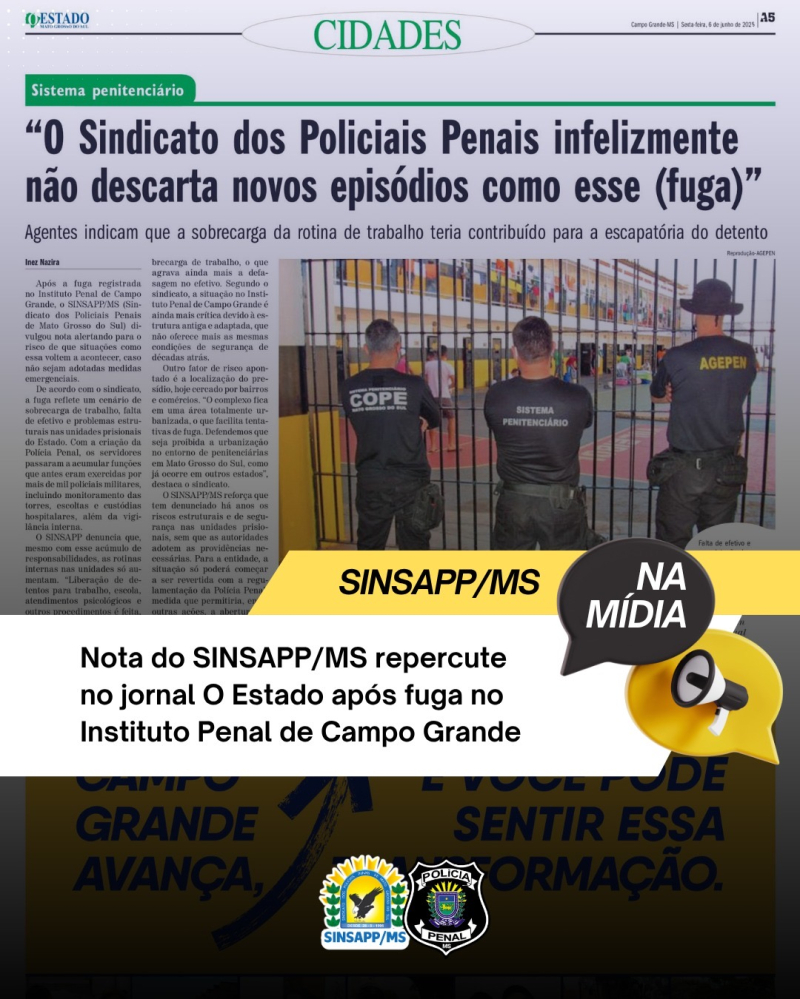 A recente fuga registrada no Instituto Penal de Campo Grande ganhou repercussão no jornal O Estado e evidenciou os graves problemas enfrentados no sistema penitenciário sul-mato-grossense. Em nota divulgada à imprensa, o SINSAPP/MS (Sindicato dos Policiais Penais de Mato Grosso do Sul) alertou que situações como essa podem se repetir caso não sejam adotadas medidas emergenciais imediatas.