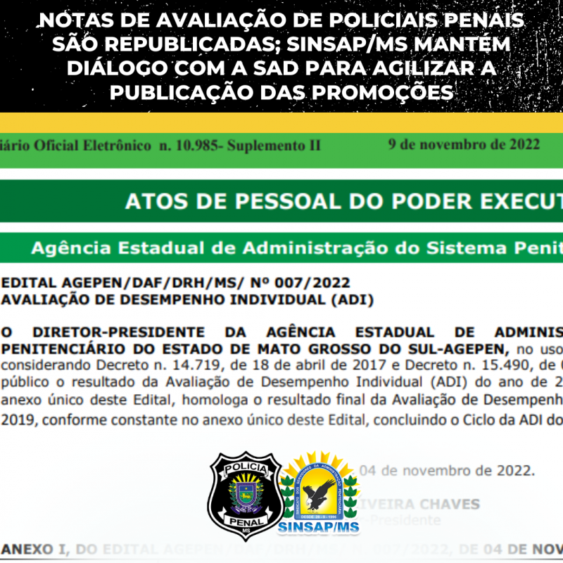 As notas da ADI (Avaliação de Desempenho Individual) dos Policiais Penais referentes aos anos de 2020 e 2021 foram republicadas, nesta quarta-feira (9), pela Agepen (Agência Estadual de Administração do Sistema Penitenciário). As notas referentes ao ano de 2019 já haviam sido republicadas recentementes.