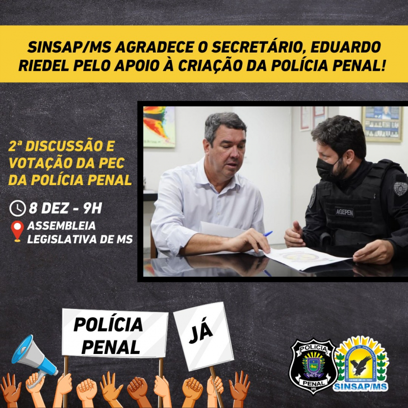 O Sinsap/MS agradece a secretaria de administração de MS, em nome do secretário, Eduardo Riedel pelo apoio à criação da Polícia Penal!