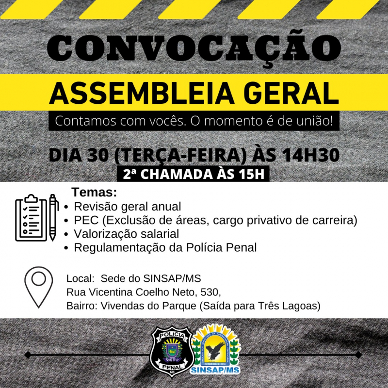 O SINSAP/MS convoca a todos os filiados para a Assembleia Geral a ser realizada nesta terça-feira, 30 de novembro (às 14h30 em primeira chamada, 15h segunda chamada), na sede do sindicato na Rua Vicentina Coelho Neto, nº 530, Bairro: Vivendas do Parque (Saída para Três Lagoas), Campo Grande /MS.