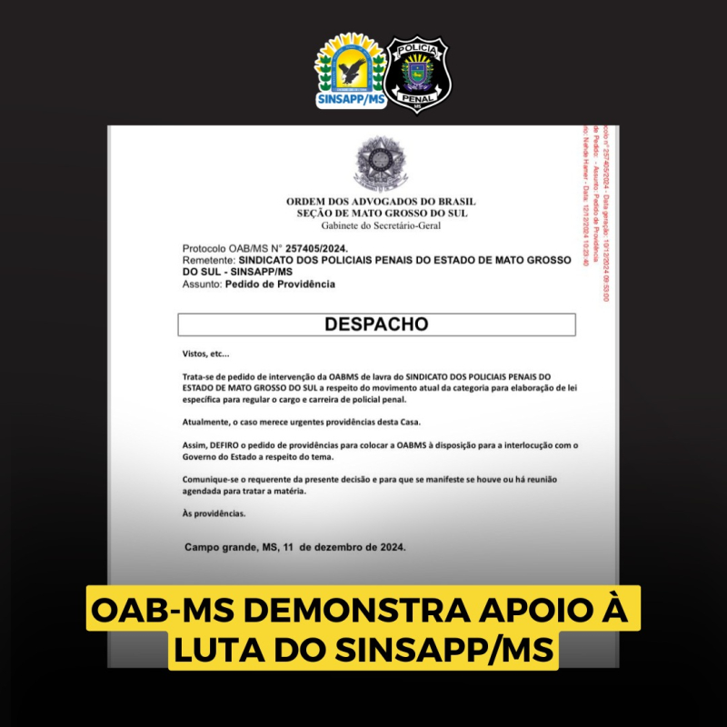 A OAB-MS protocolou um documento manifestando que a entidade está à disposição do Sinsapp/MS para a interlocução com o Governo do Estado a respeito do movimento atual da categoria para elaboração de lei específica para regular o cargo e carreira de policial penal.