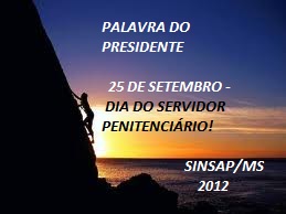 O Presidente do Sindicato dos Servidores da Administração Penitenciária do Estado de Mato Grosso do Sul - SINSAP/MS e diretoria parabenizam cada servidor penitenciário pela coragem, luta e união com que vem desempenhando suas funções. É um grande orgulho ser Servidor Penitenciário, uma categoria que tem passado muitas dificuldades, mas que ao longo de sua existência tem muitas vitórias conquistadas e muitas outras a conquistar! Unidos pelo mesmo objetivo chegaremos a um horizonte onde o brilho de cada um de nós ofuscará os nossos desafios, alcançando a vitória e a realização de cada servidor penitenciário! Este ano, o SINSAP/MS não realizará uma festa em comemoração ao dia do servidor penitenciário, por investir na construção do nosso Grêmio Recreativo (que terá como anexo nossa sede administrativa), que está numa fase bem adiantada,e, no final do ano faremos uma linda festa, que todos merecemos: no nosso espaço, na nossa tão sonhada sede e estrutura física para recreação, lazer e esporte. Você merece, servidor penitenciário, ver sonhos se concretizarem, sua sede administrativa, seu Grêmio para momentos de alegrias são motivos para comemorar! Outras conquistas como o porte de arma e reestruturação de nossa carreira e aposentadoria especial também serão realidade! Estamos lutando por todos nós!!! Parabéns, felicidades e muitas realizações!!! Estamos sempre à disposição! Abraços do Presidente Francisco Américo SANÁBRIA