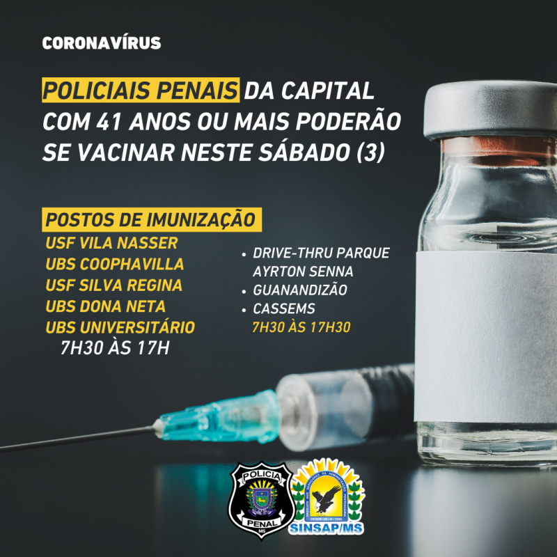 O SINSAP/MS, que realizou campanha pedindo a vacinação, parabeniza e reconhece o esforço do Governo do Estado, mas destaca que é extremamente importante levar a imunização para os Policiais Penais do interior do Estado.