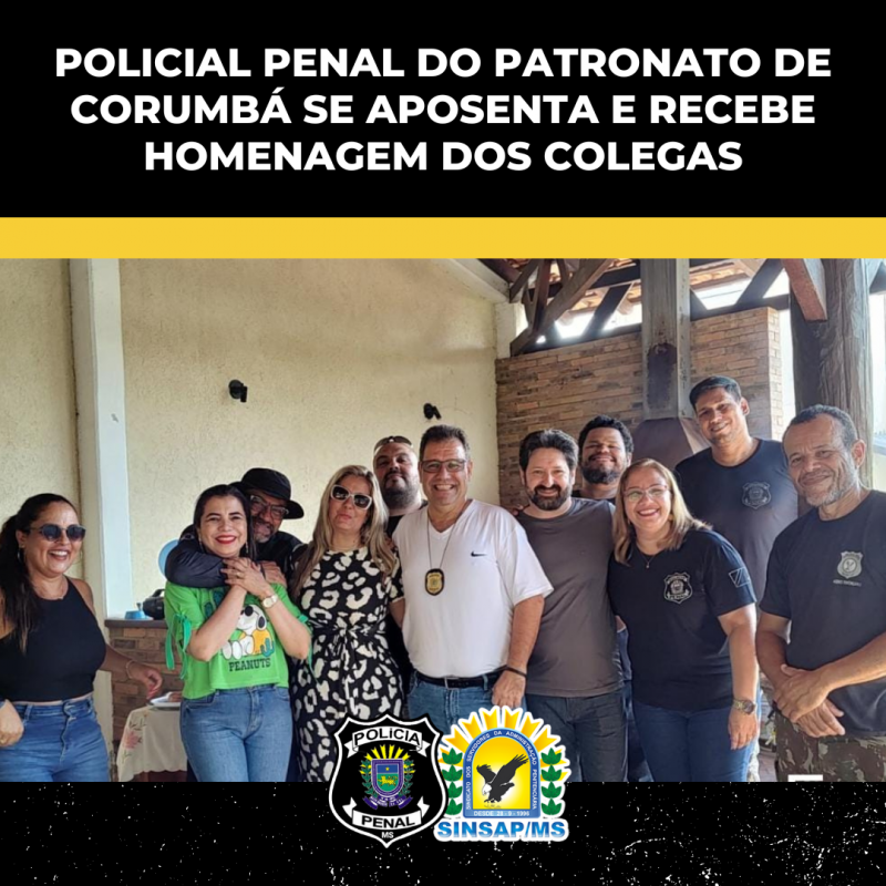 O policial penal Jeziel Duarte Passos, do Patronato de Corumbá, se aposentou na última semana e recebeu uma homenagem nos colegas. O SINSAP/MS acompanhou o momento de despedida e parabenizou o servidor pela dedicação ao sistema penitenciário sul-mato-grossense.