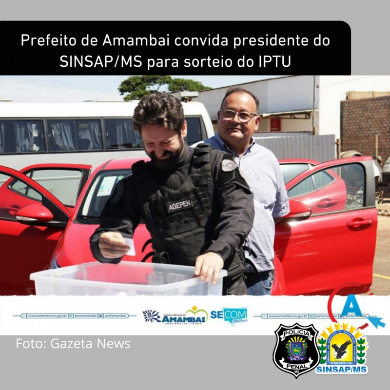 O Presidente do SINSAP/MS, André Santiago, foi convidado pelo prefeito de Amambai, Edinaldo Bandeira, para o sorteio dos prêmios para quem tem o ITPU em dia na cidade, na manhã desta quarta-feira,06.