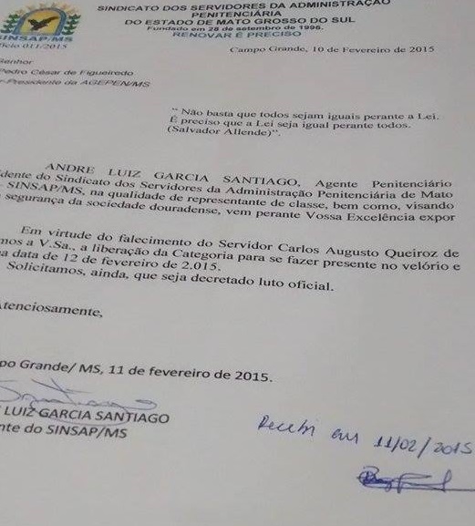 Na tarde desta quarta-feira o presidente do Sindicato dos Servidores da Administração Penitenciária de Mato Grosso do Sul (Sinsap), André Luiz Santiago, encaminhou ao diretor-presidente da Agência Estadual de Administração do Sistema Penitenciário (Agepen), por meio de oficio a solicitação de dispensa dos agentes nesta quinta-feira (12), para prestar homenagem à memória do servidor CARLOS AUGUSTO QUEIRÓZ DE MENDONÇA, morto a tiros nesta manhã durante o plantão.