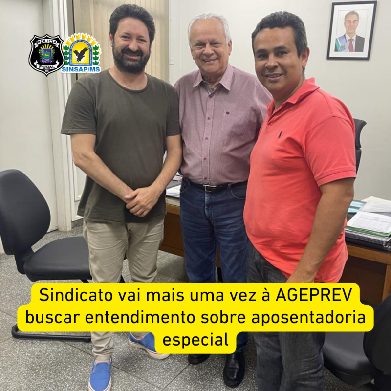 O presidente do SINSAP/MS, André Santiago, e o policial penal Gilson Martins, estiveram reunidos na última terça-feira, 31, com o diretor-presidente da AGEPREV, Jorge Oliveira Martins, e com a procuradora da agência, Renata Raule, novamente para buscar entendimento quanto a aposentadoria especial da polícia penal de Mato Grosso do Sul.