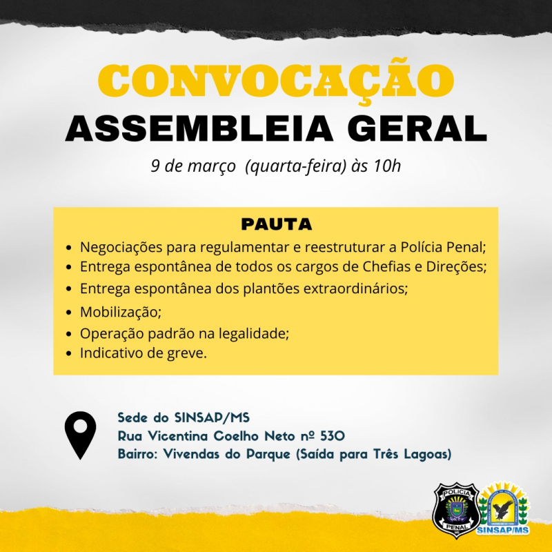 O SINSAP/MS convoca seus filiados para a Assembleia Geral que será realizada no dia 09 de março às 10h na sede do sindicato, Rua Vicentina Coelho Neto nº 530. Bairro: Vivendas do Parque (Saída para Três Lagoas).