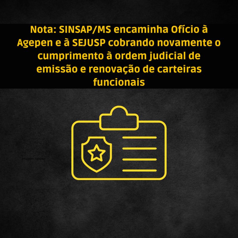 O Sindicato dos Servidores da Administração Penitenciária de Mato Grosso do Sul (Sinsap/MS) encaminhou nesta terça-feira, (19), ofício à Agência Estadual de Administração do Sistema Penitenciário (Agepen) e à Secretaria de Justiça e Segurança Pública de Mato Grosso do Sul (SEJUSP) cobrando novamente a emissão e renovação imediata das carteiras funcionais físicas de todos os policiais penais estaduais em cumprimento à ordem judicial expedida no mandado de segurança n.º 1413753-34.2020.8.12.0000.