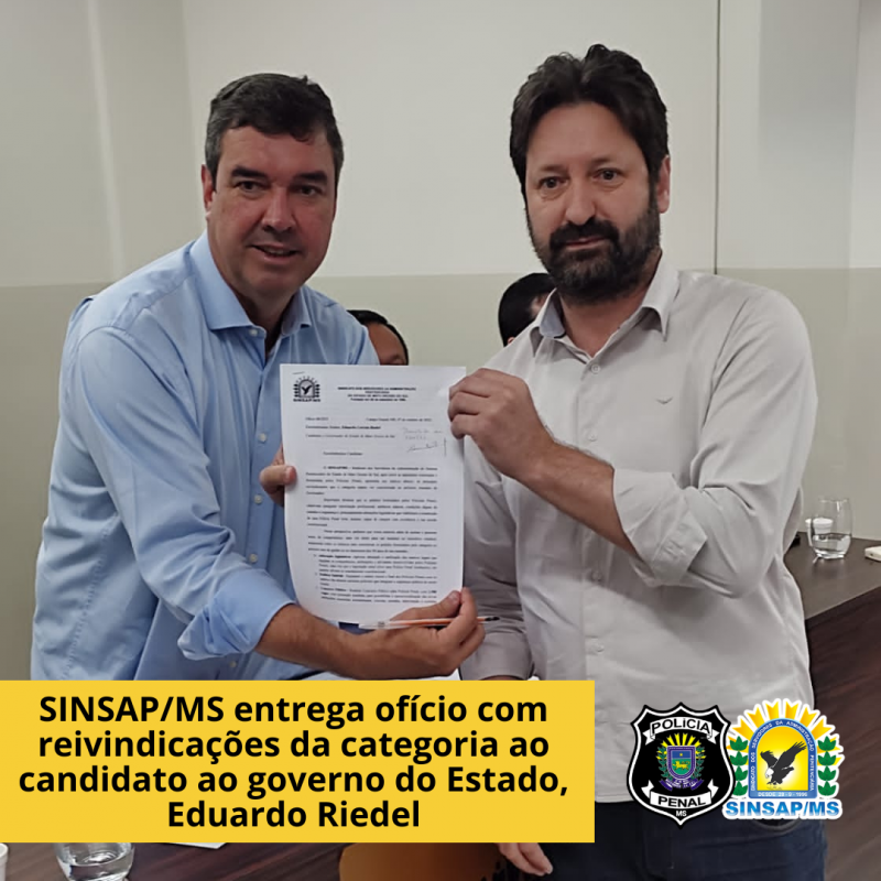O SINSAP/MS entregou, na manhã desta quinta-feira (7), as reivindicações da categoria ao candidato ao governo do Estado, Eduardo Riedel. A entrega aconteceu durante plenária do Fórum de Servidores de Mato Grosso do Sul com o candidato, em Campo Grande.