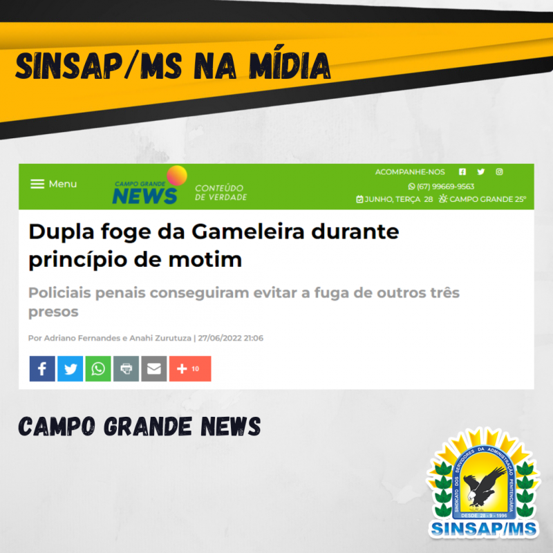 O site Campo Grande News repercutiu a fuga de dois internos da Gameleira, em Campo Grande, durante princípio de motim. Policiais penais conseguiram evitar a fuga de outros três presos.