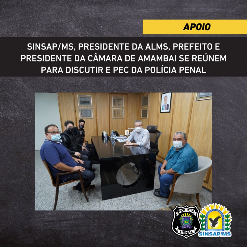 A diretoria do SINSAP/MS esteve reunida com o presidente da Assembleia Legislativa de Mato Grosso do Sul, Deputado Paulo Corrêa, juntamente com o prefeito de Amambai, Edinaldo Luiz de Melo Bandeira, e o presidente da Câmara de Vereadores de Amambai, Valter Brito da Silva. A reunião foi para tratar da celeridade na aprovação da PEC que cria a Polícia Penal em MS.