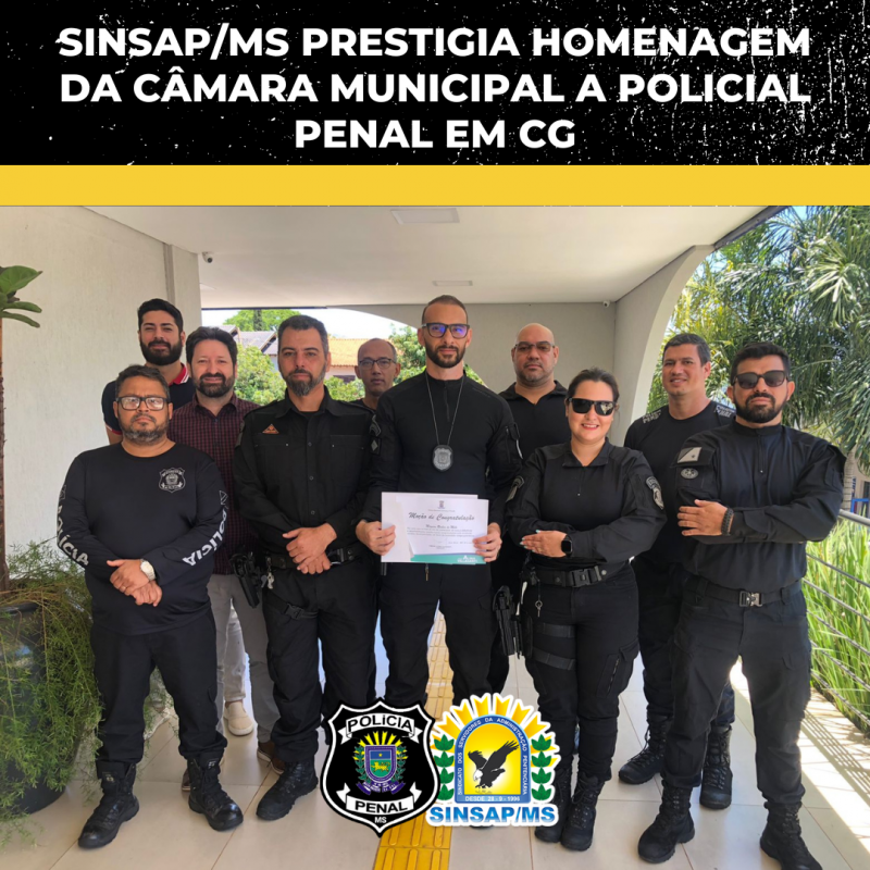 Parte da diretoria do SINSAP/MS participou da homenagem ao policial penal Maycon Roslen de Melo, na Câmara Municipal de Campo Grande, nesta terça-feira (25). Melo recebeu uma Moção de Congratulação pelos 21 anos de carreira na Agepen (Agência Estadual de Administração do Sistema Penitenciário). A homenagem foi proposta pelo vereador Alírio Villasanti.
