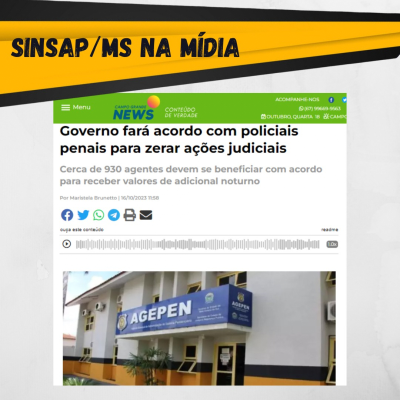 O Governo do Estado, através da PGE (Procuradoria Geral do Estado), deve fechar acordos individuais com cerca de 930 policiais penais para quitar valores de adicional noturno e encerrar uma disputa judicial que tramita desde agosto de 2014. Os agentes deverão manifestar o interesse de receber os valores já reconhecidos pela Justiça com deságio de 30% e abrir mão de ação de cobrança.