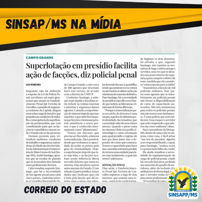 Ao jornal, o presidente do SINSAPP/MS, André Santiago, destacou que a superlotação no Presídio de Segurança Máxima de Campo Grande, onde ocorreu duas fugas nesta semana, facilita a ação de facções.
