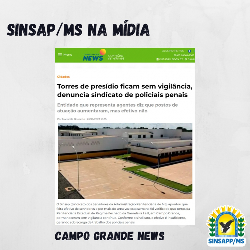 O Sinsap (Sindicato dos Servidores da Administração Penitenciária de MS) apontou que falta efetivo de servidores e por mais de uma vez esta semana foi verificado que torres da Penitenciária Estadual de Regime Fechado da Gameleira I e II, em Campo Grande, permaneceram sem vigilância contínua. Conforme o sindicato, o efetivo é insuficiente, gerando sobrecarga de trabalho dos policiais penais.