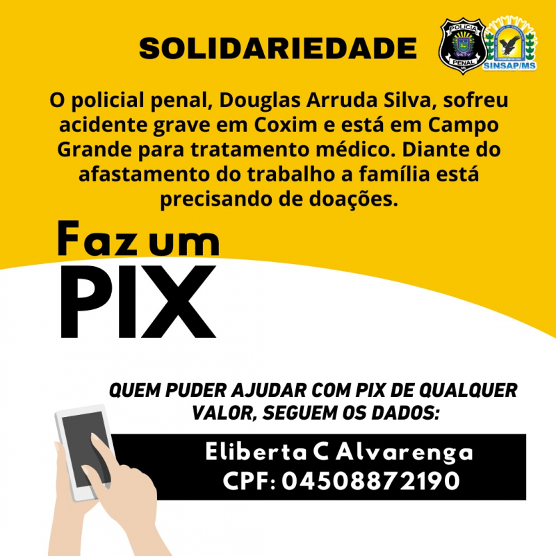 O policial penal, Douglas Arruda Silva, sofreu acidente grave em Coxim e está em Campo Grande para tratamentos médicos. Diante do afastamento do trabalho a família está precisando de doações.