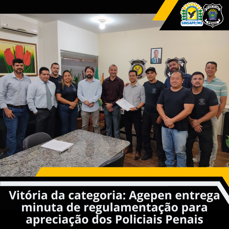 A comissão entregou a minuta à gestão, que disponibilizou o documento aos Policiais Penais. Para que a categoria possa analisar a minuta apresentada pela Agepen, o SINSAPP/MS convoca todos os Policiais Penais para assembleia geral na próxima segunda-feira (20), às 14h, na sede do Sindicato em Campo Grande.